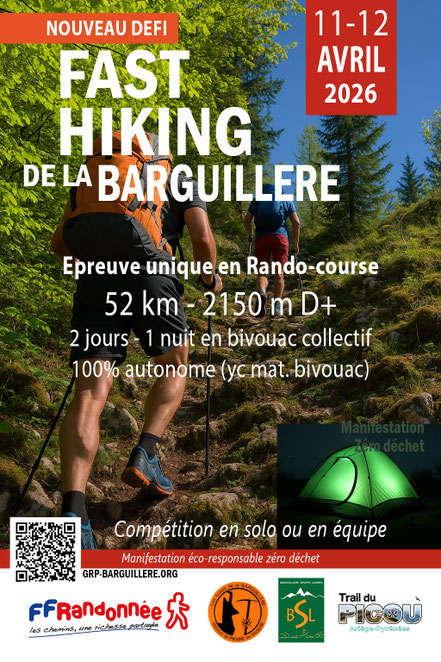 Épreuve unique en rando-course : 52km – 2150 m D+ / 2 jours – 1 nuit en bivouac collectif / compétition en solo ou en équipe. Pour en savoir plus vous pouvez consulter l’article « Fast-Hiking GRP Tour de la Barguillère » sur le site GRP Barguillère.
