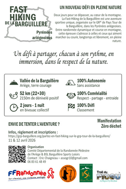 Les 11 et 12 avril prochains ne manquez pas le Fast-Hiking GR® de Pays Tour de la Barguillère, une manifestation sportive de pleine nature se déroulant en milieu montagnard, sur l’itinéraire balisé et homologué du GR® de Pays Tour de la Barguillère. Départ le 11 avril de Saint-Pierre-de-Rivière.